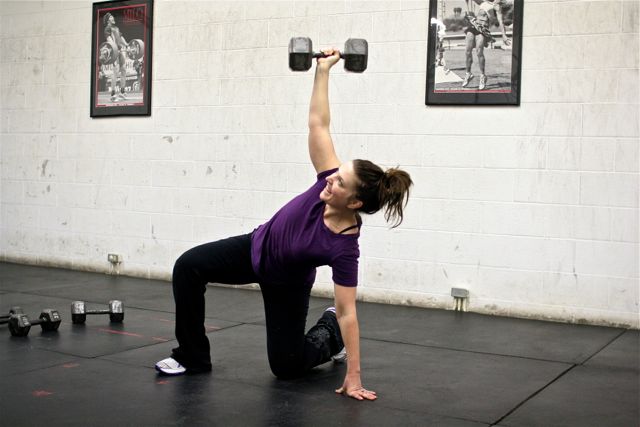 After safely getting the weight into place assume the starting position with the working arm locked out overhead and the leg on that same side bent (third picture). From here push yourself up to a seated position with the weight still locked out overhead (fourth picture).